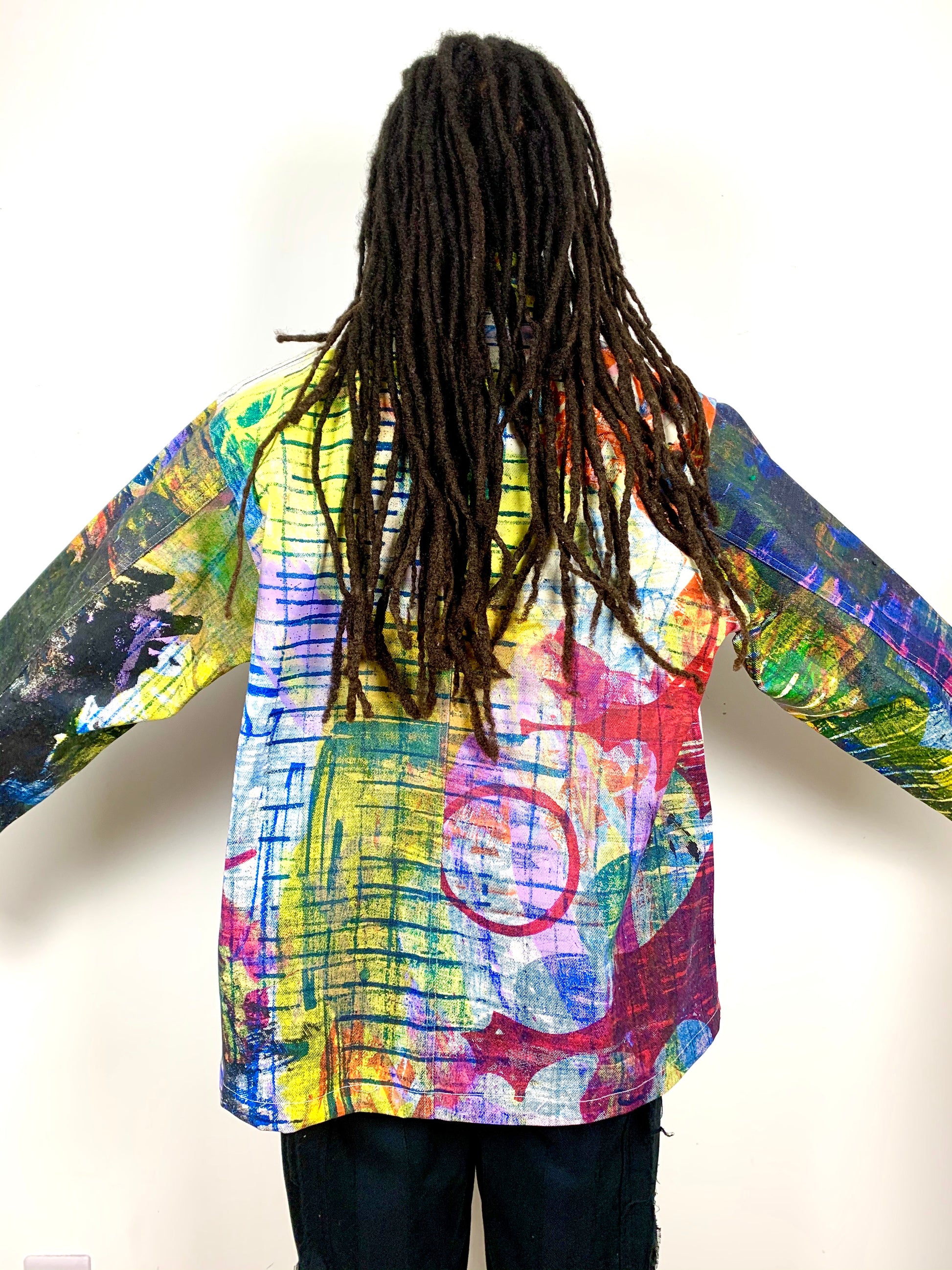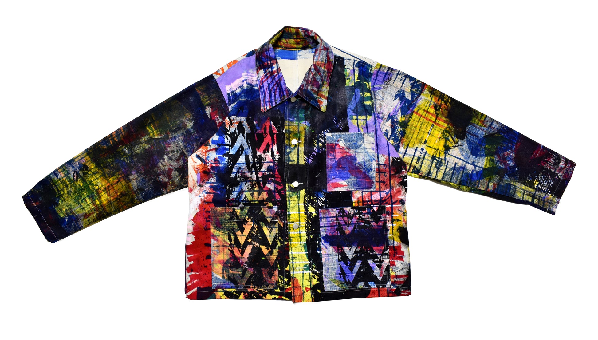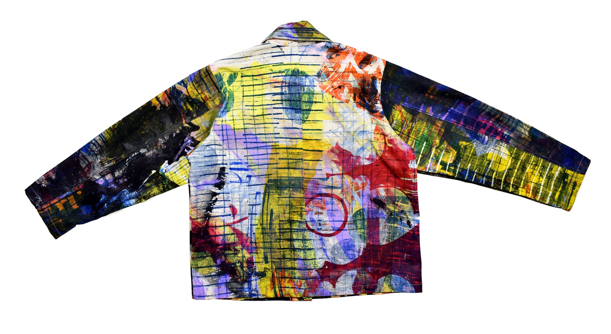 Made from durable, unbleached denim, its heavy weight adds a practicality to this wearable art piece.