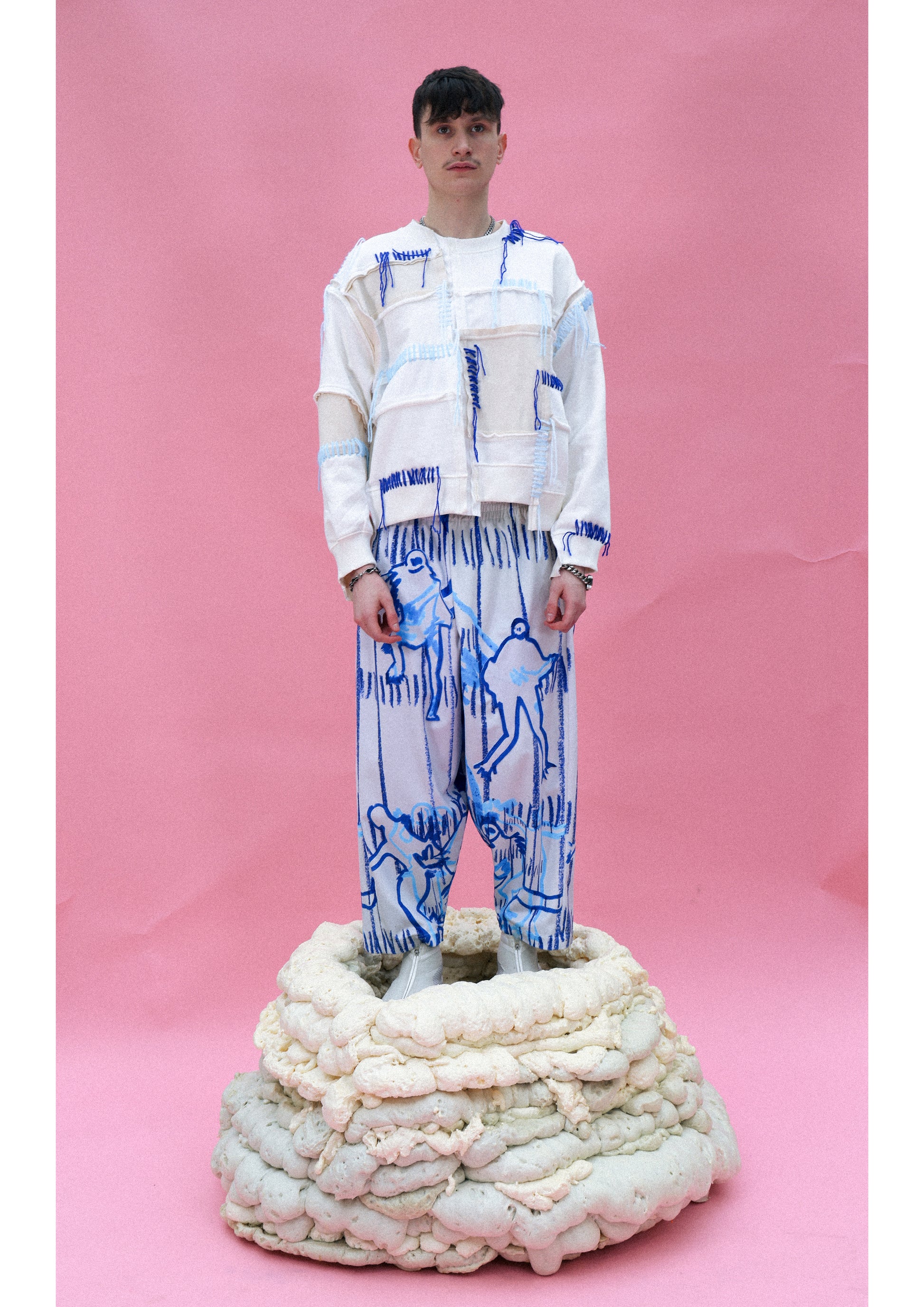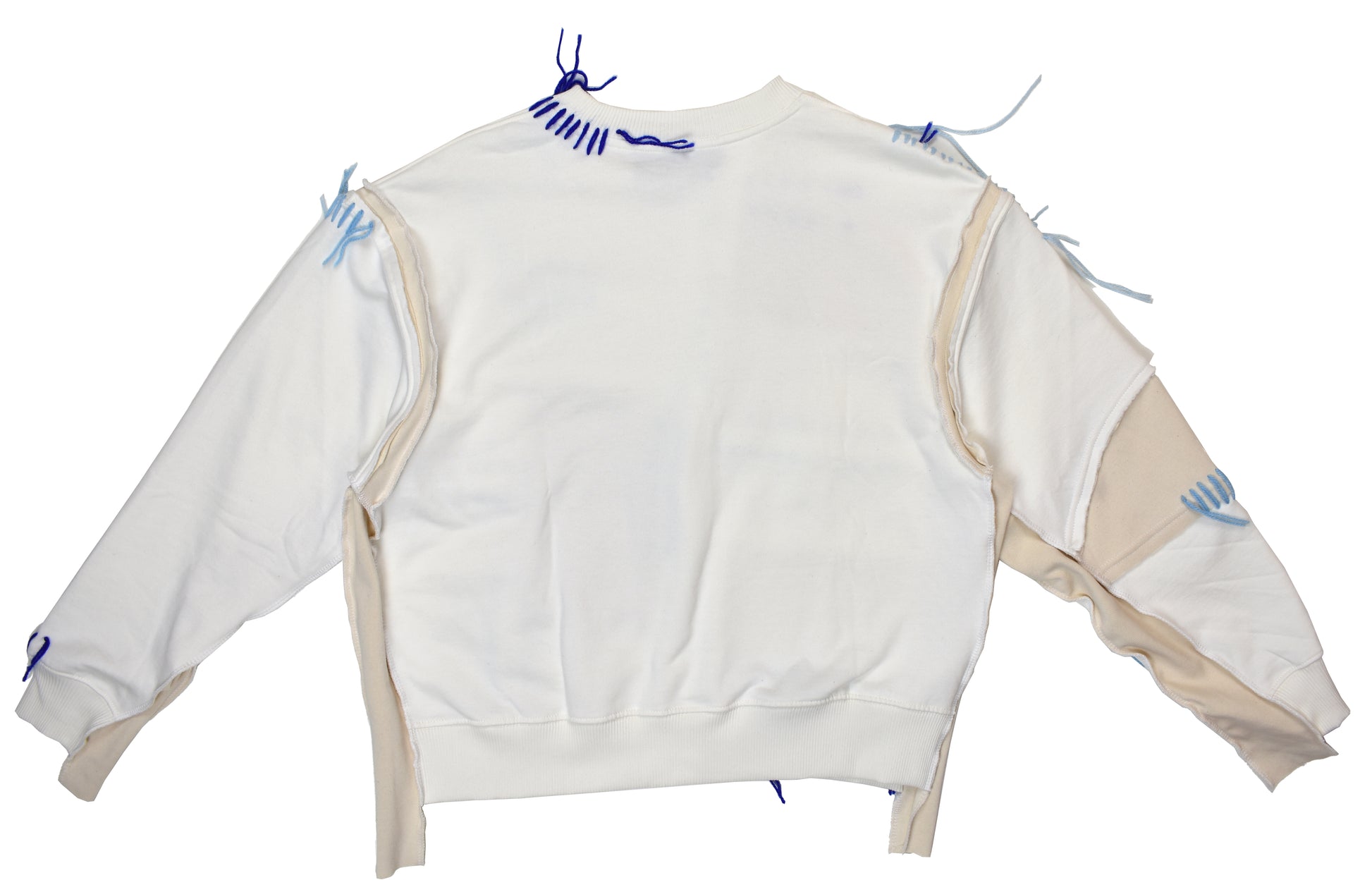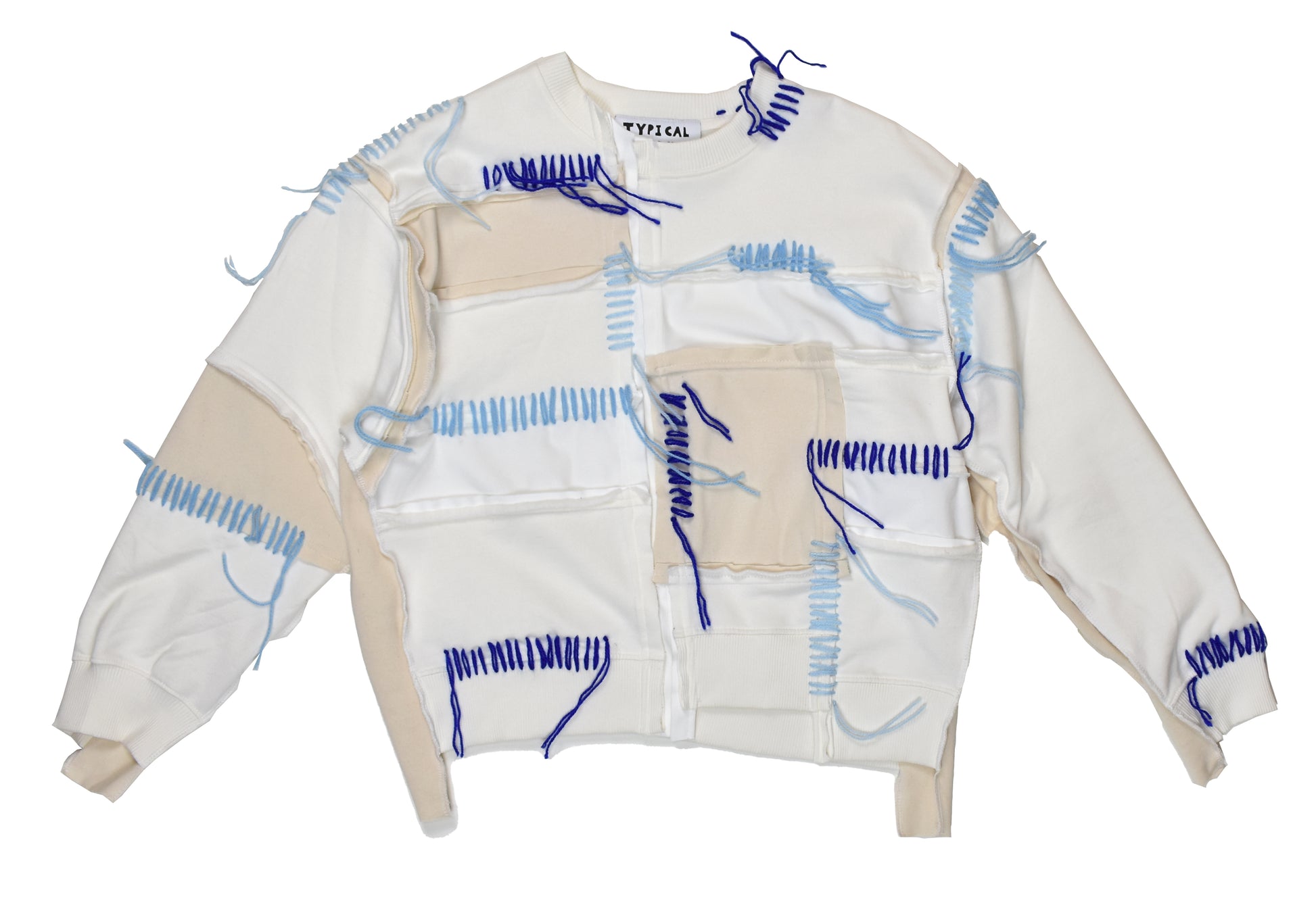 Expertly crafted with a patchwork style and featuring different textures, the Blue Stitches Sweatshirt is a labour of love with its hand-stitched details.