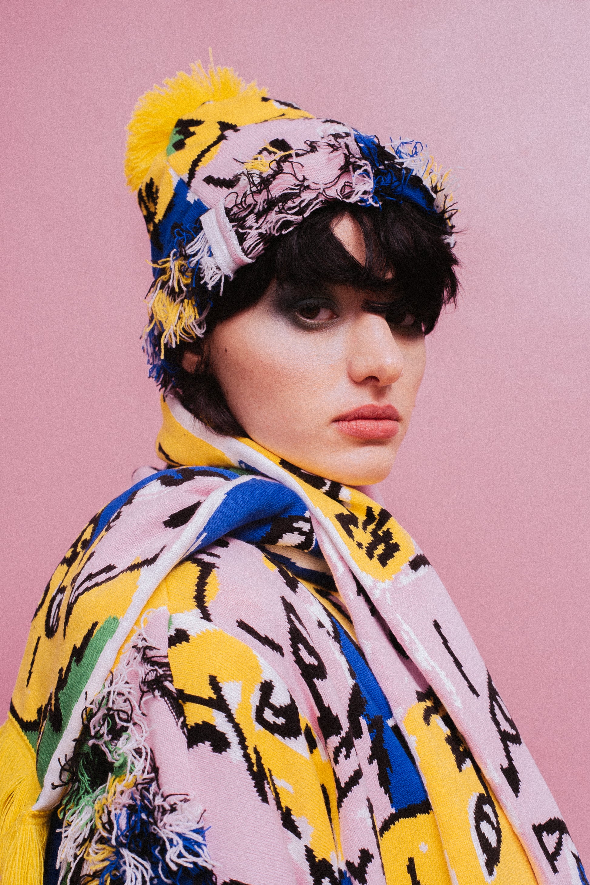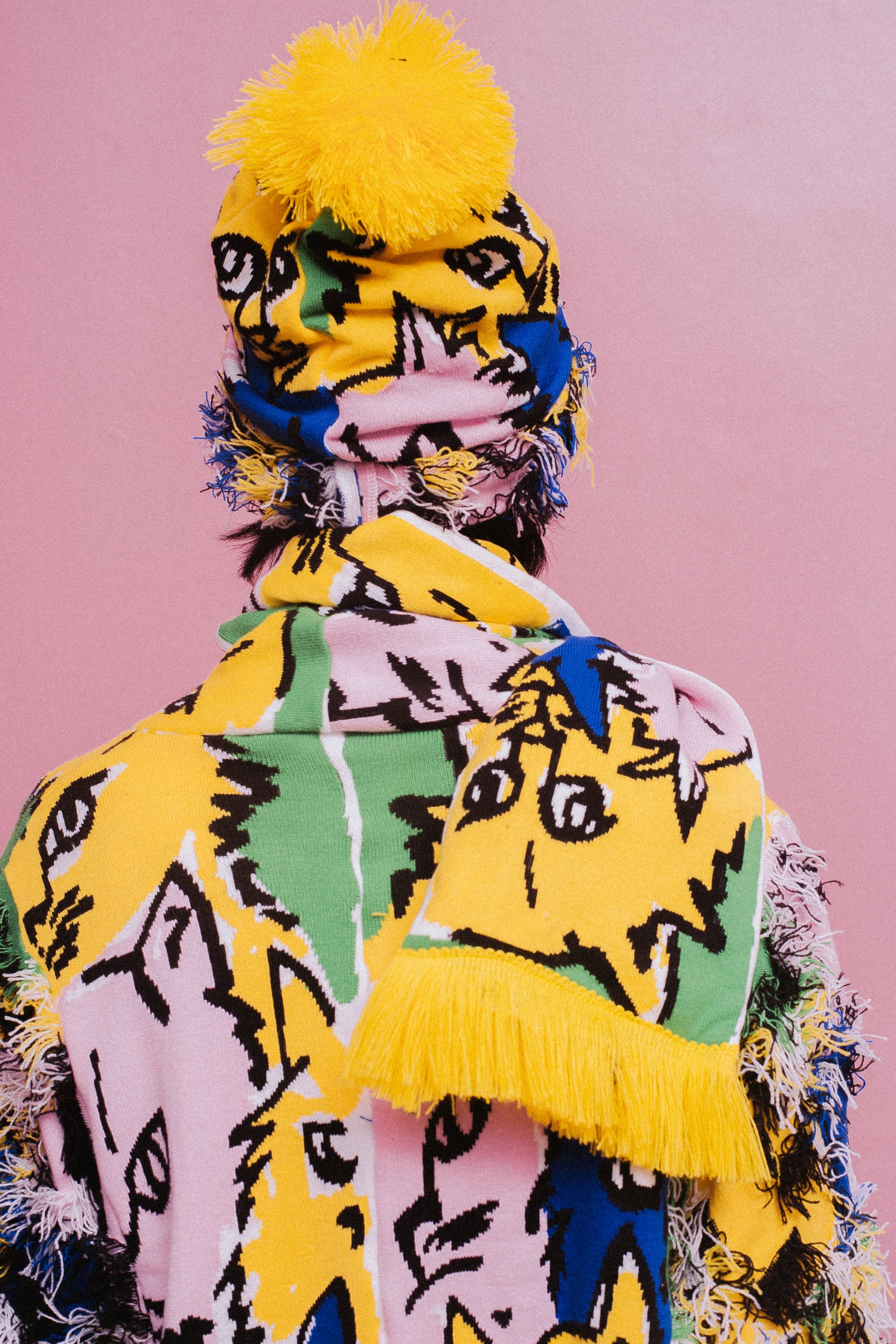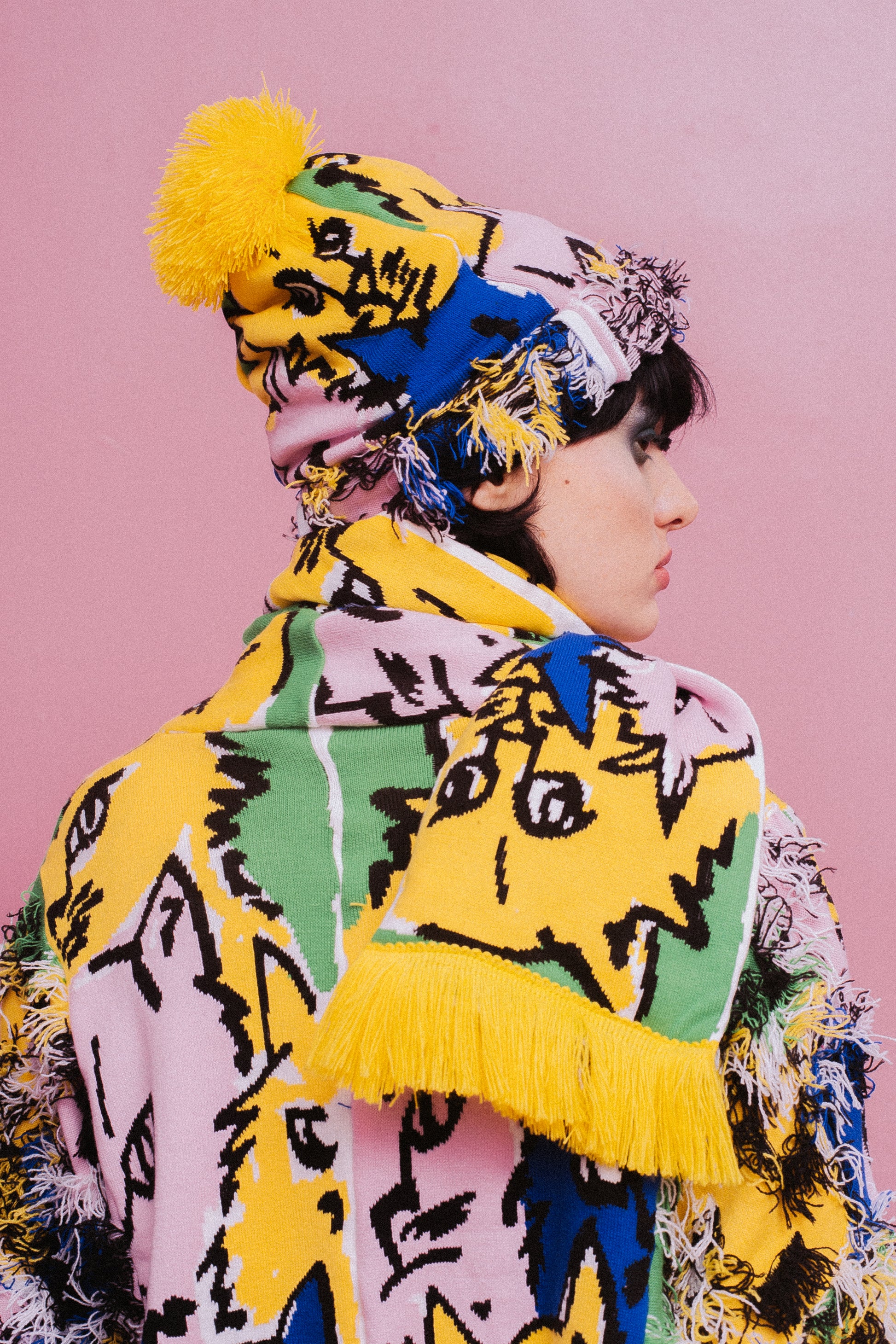 Knitted beanie hat with pom pom on top and cat motif throughout.