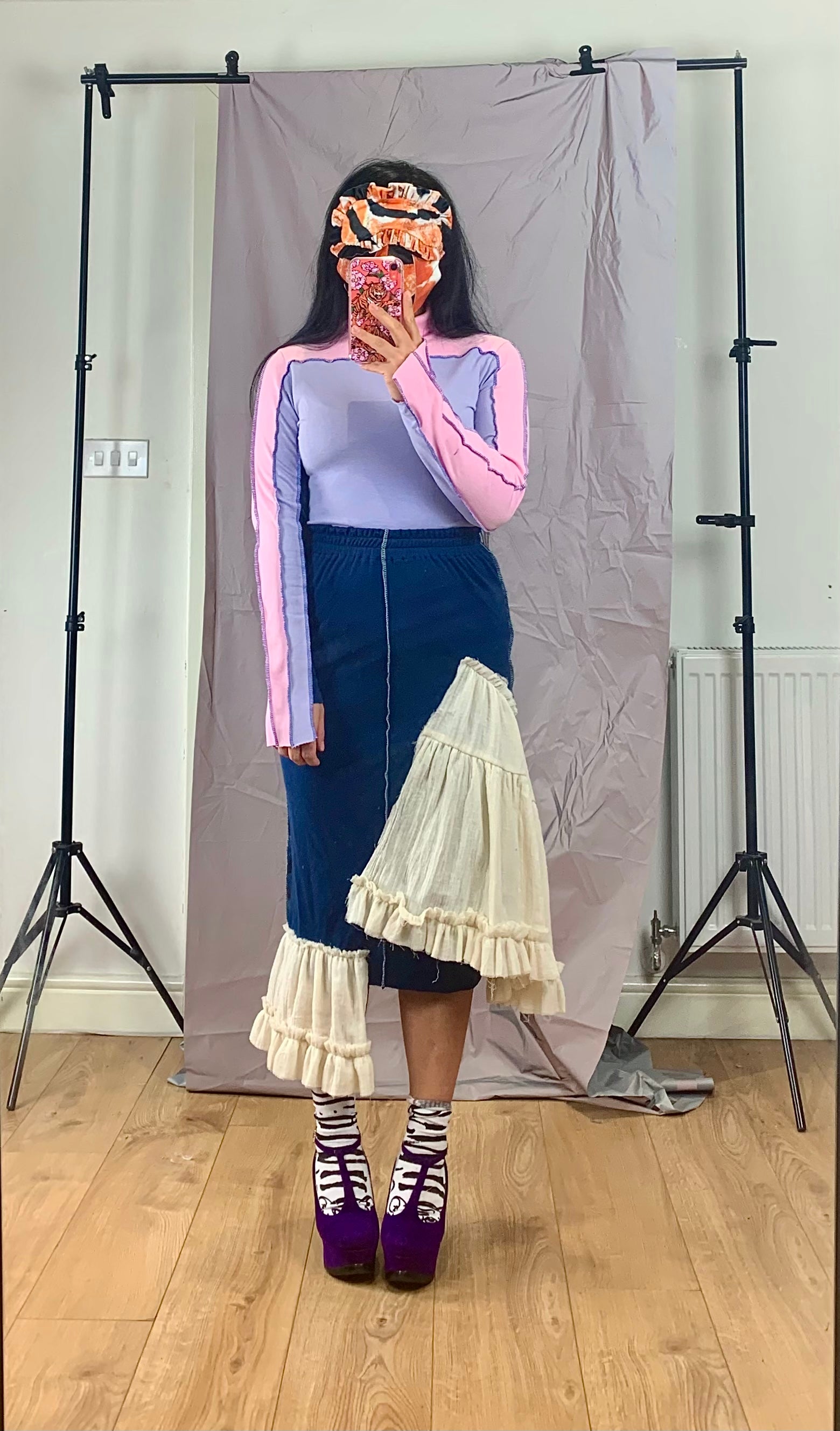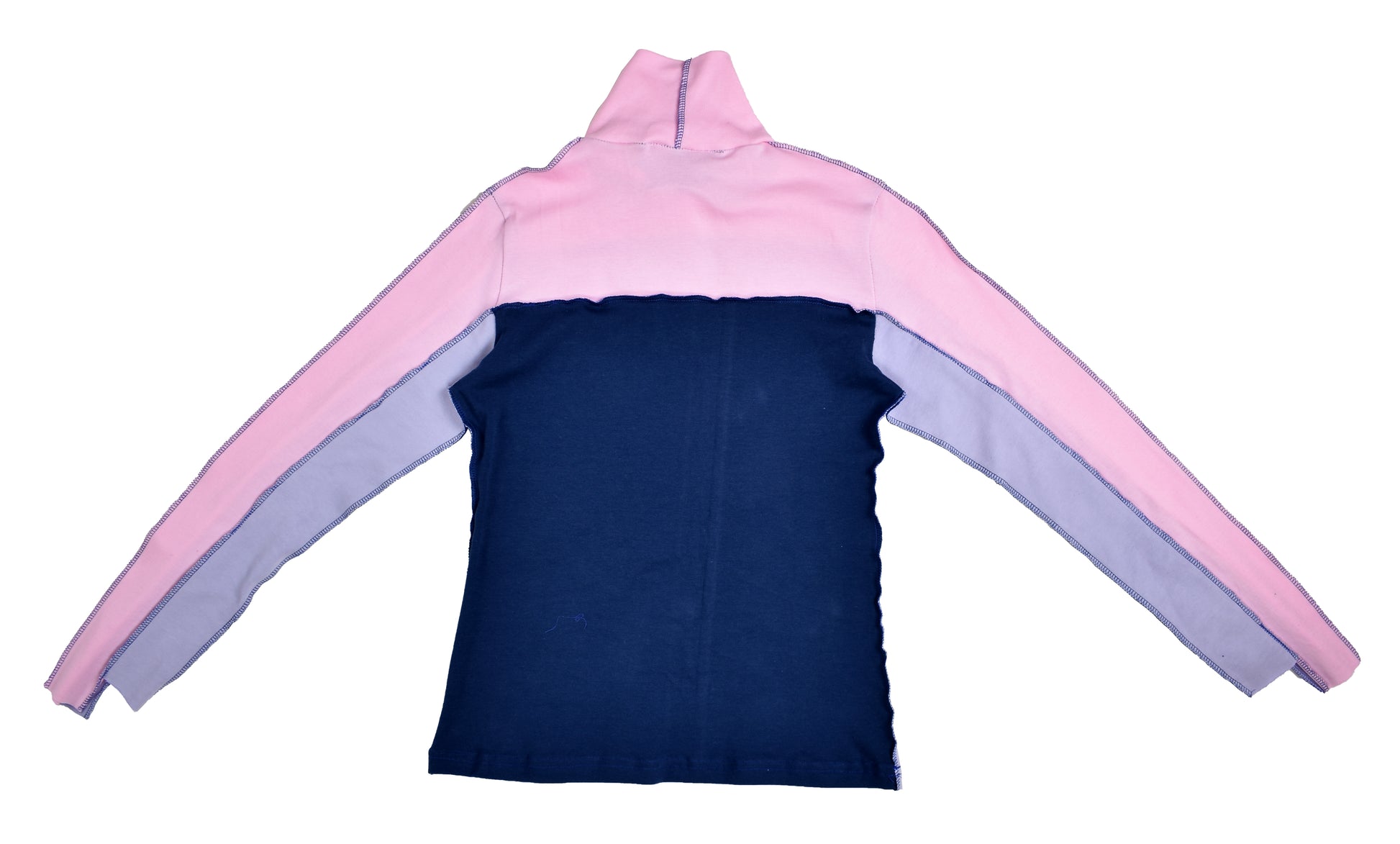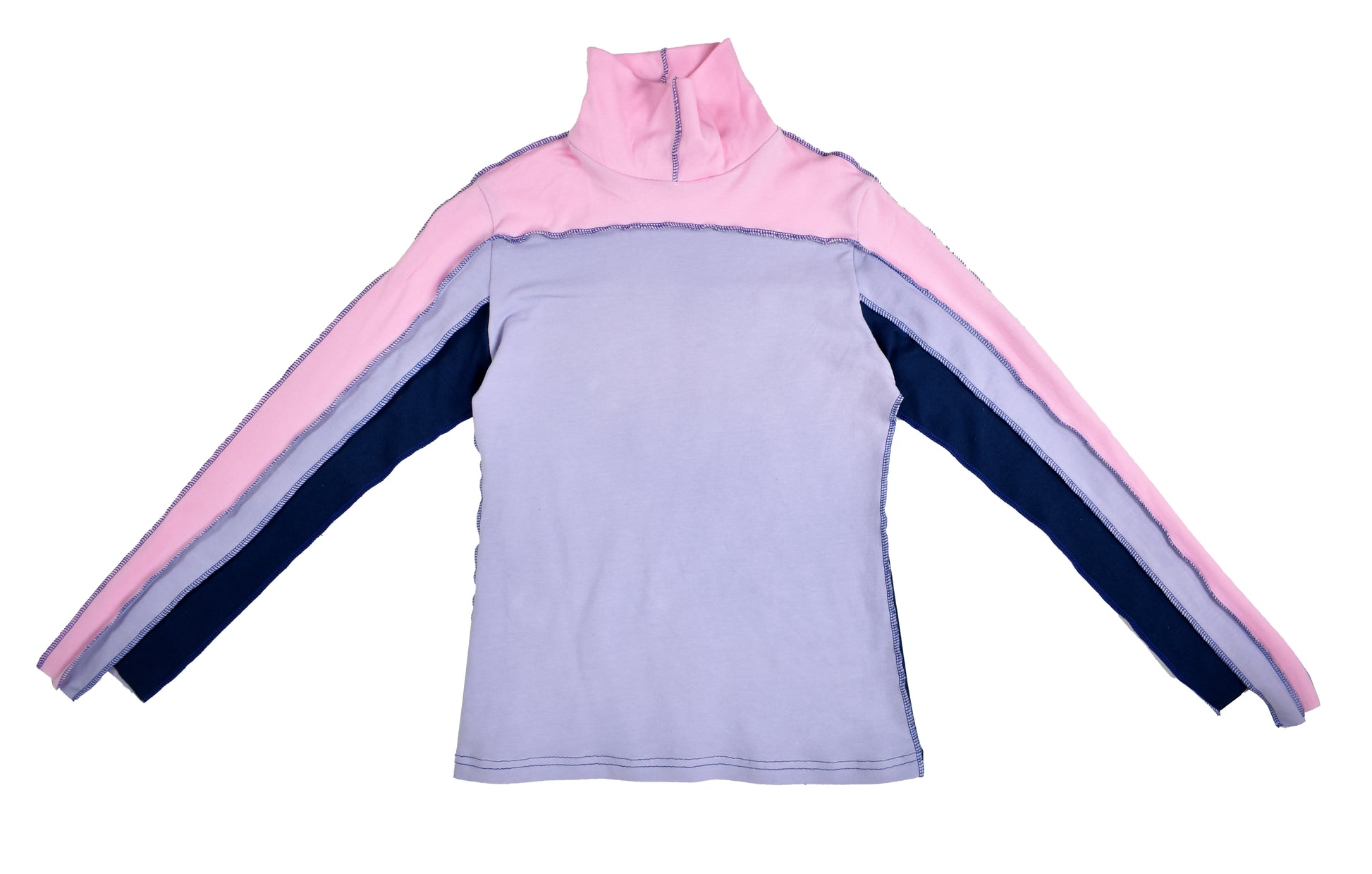 Deconstructed style tope with reversed seams and asymmetric sleeves.