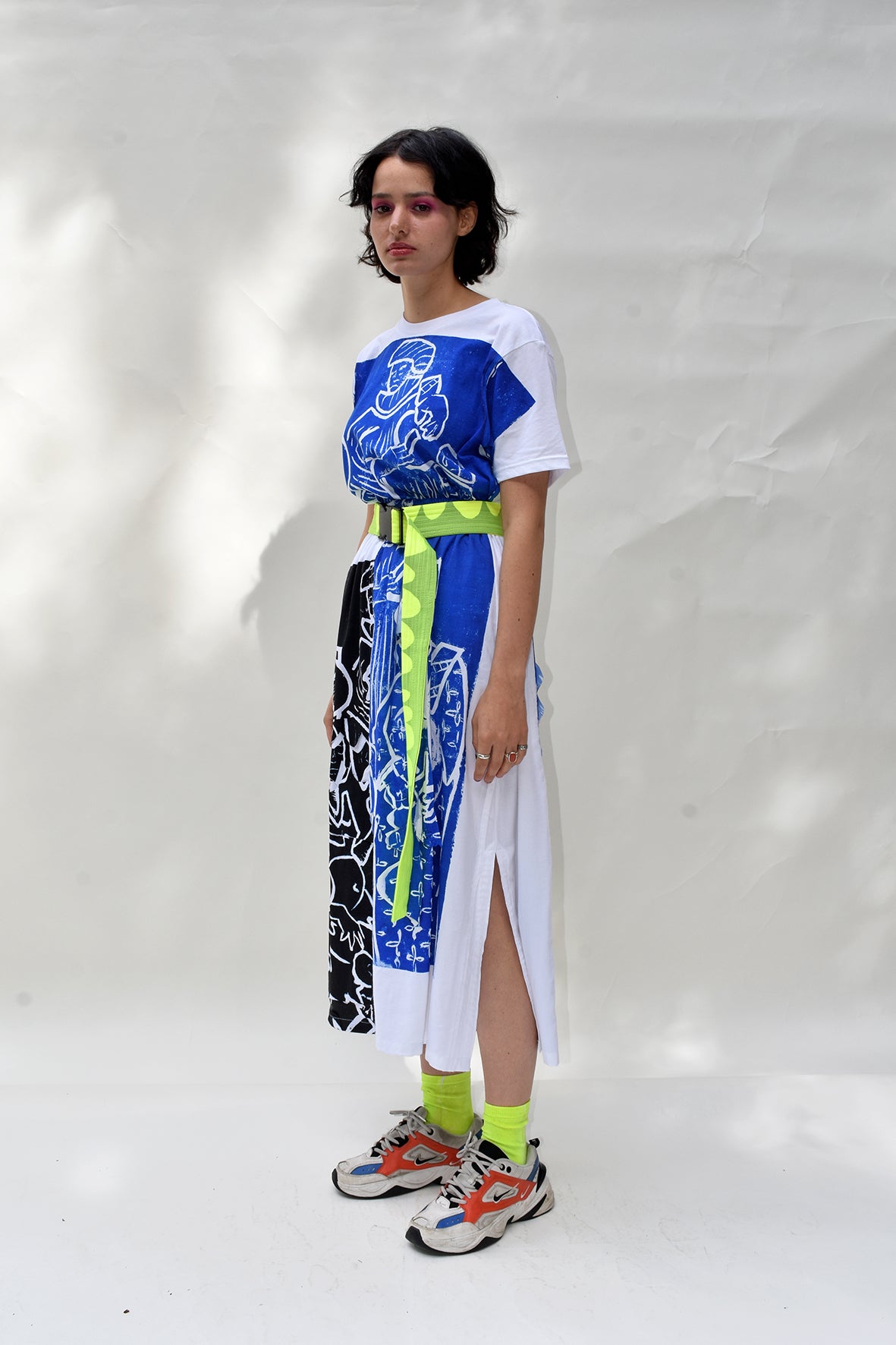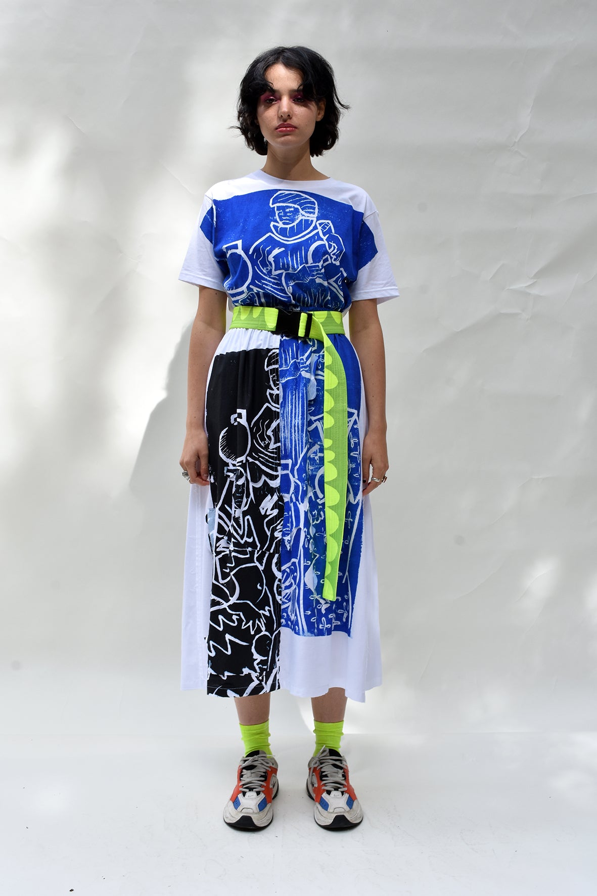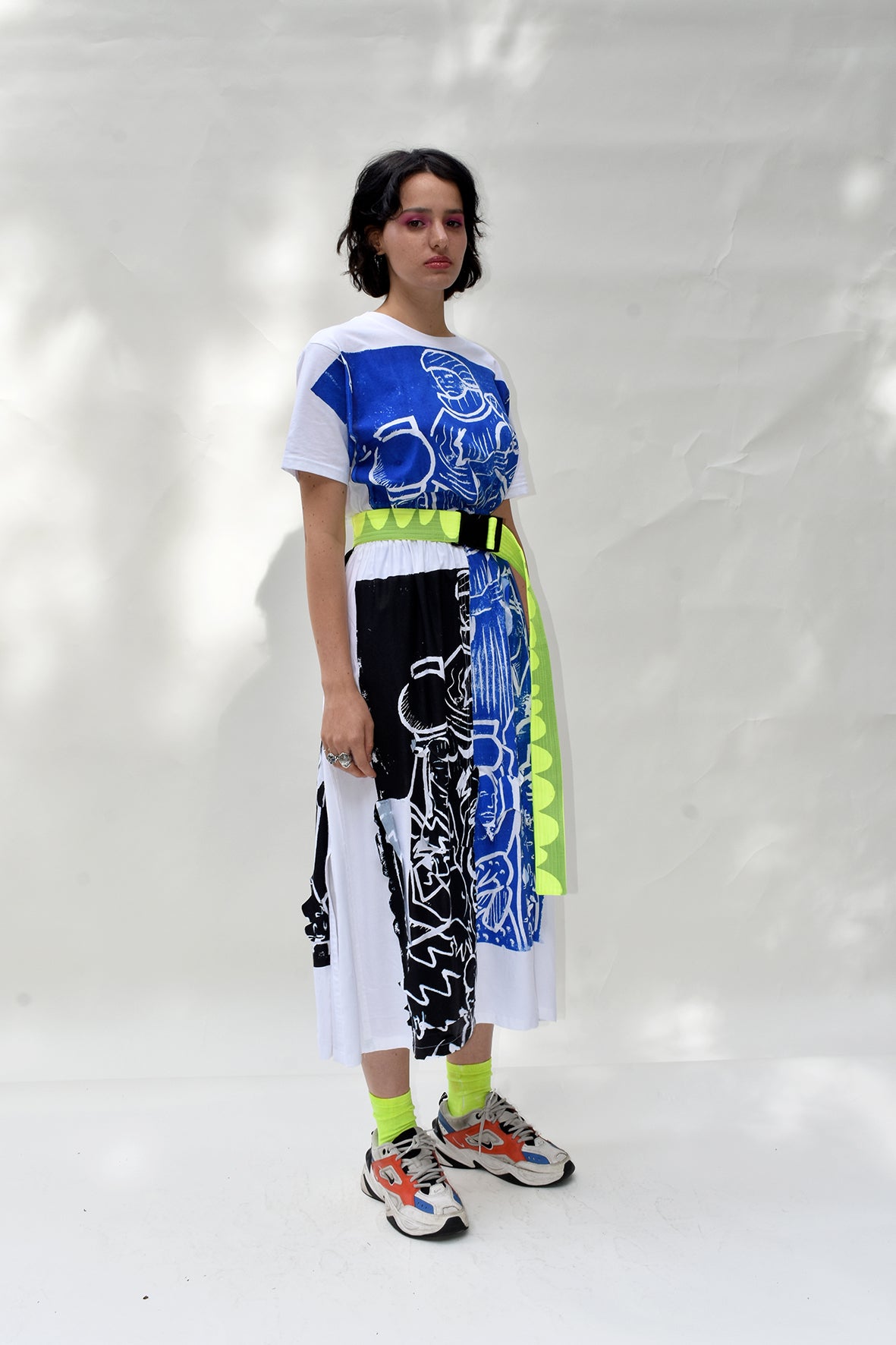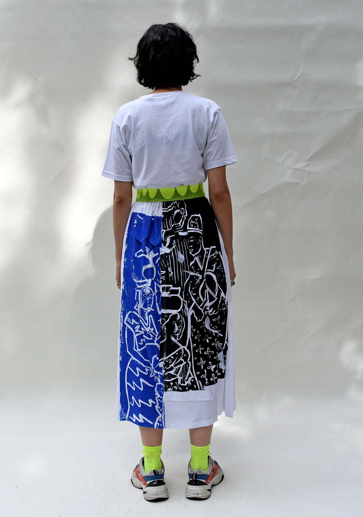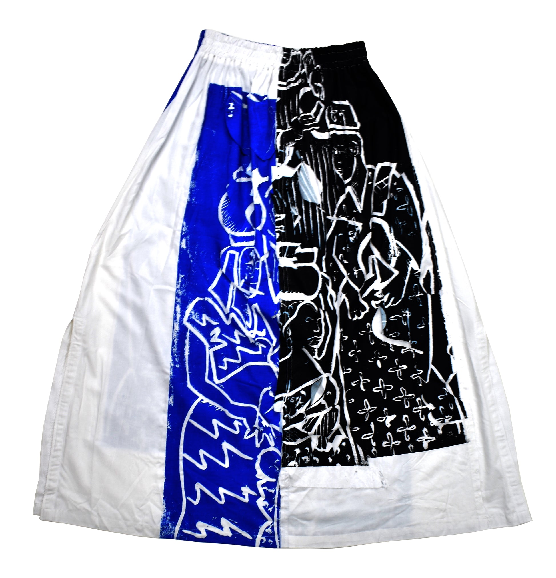 Typical Freaks' affinity for modern art, combined with traditional handcrafts is reflected by the lively appliqued illustration in blue and black. Taking inspiration from traditional Nigerian folk art, the skirt features an innovative technique developed in house, of meticulously placing appliqued layers of fabric in areas to accentuate the print on top.