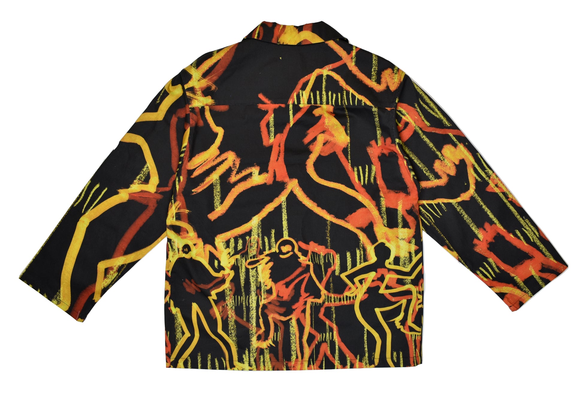 Features a bold print of swirling lines and dynamic, dancing figures.