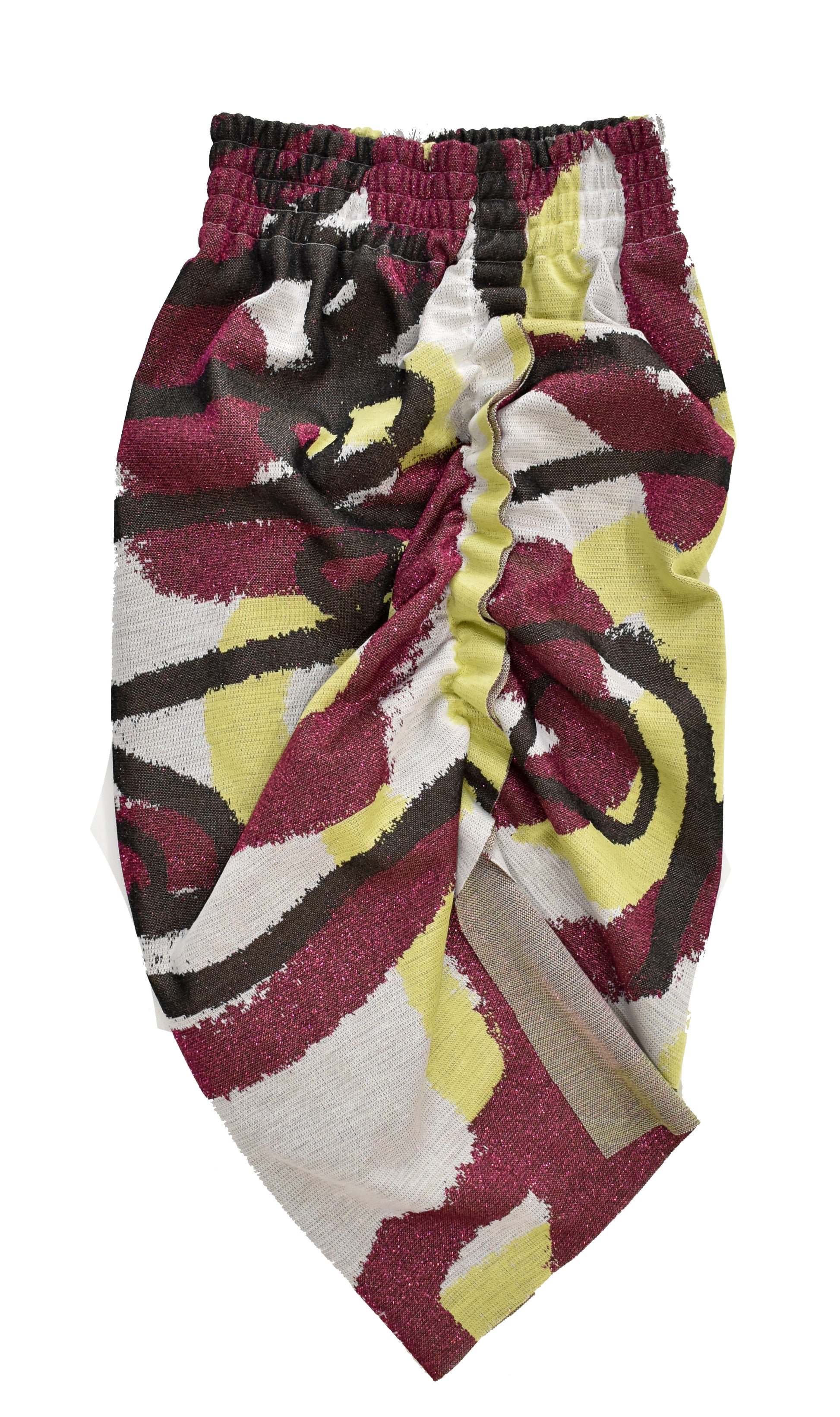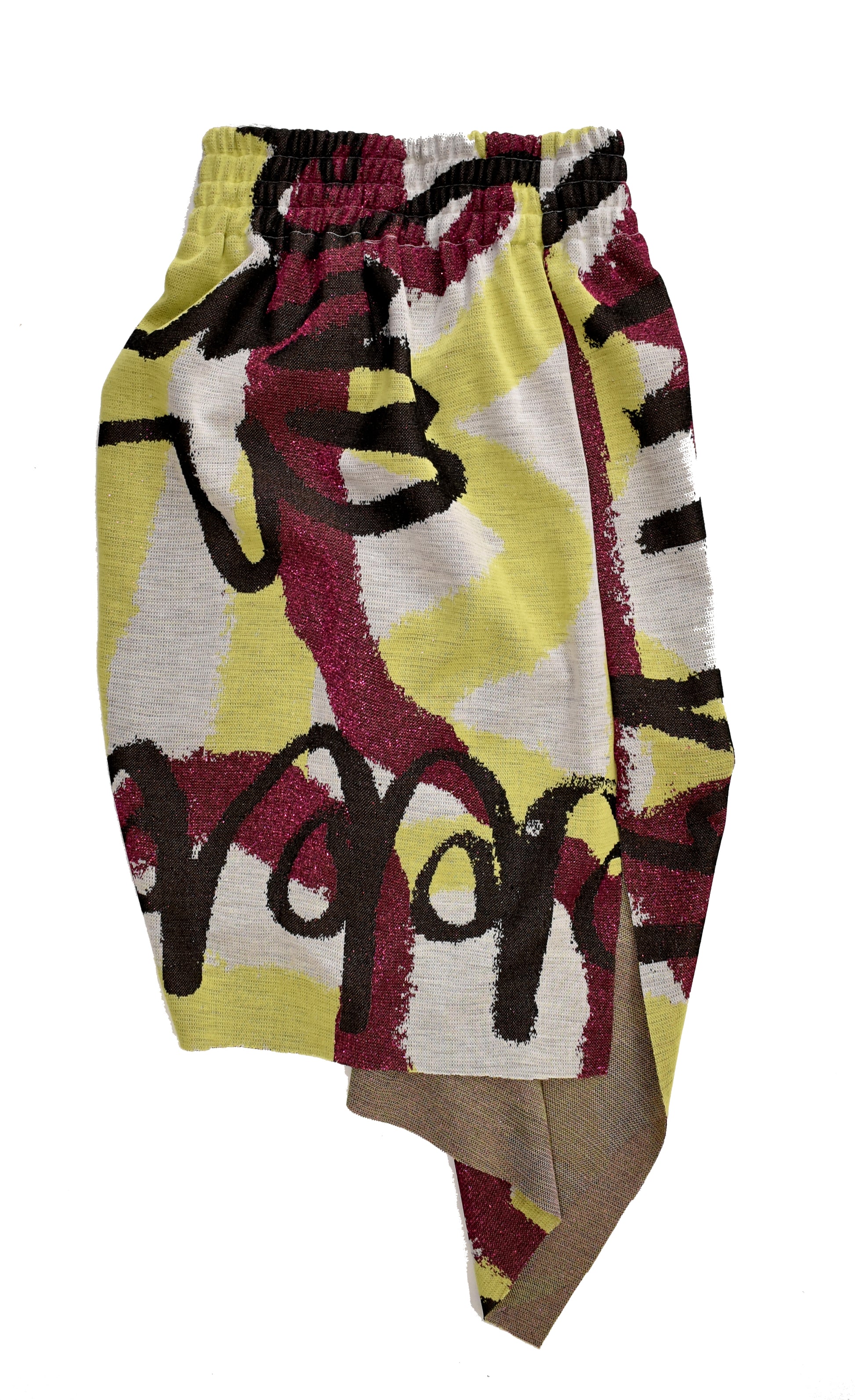 Asymmetric, ruched skirt featuring hand drawn crayon motif of limbs. Intricate jacquard knit with lurex yarns to create a glitter effect.