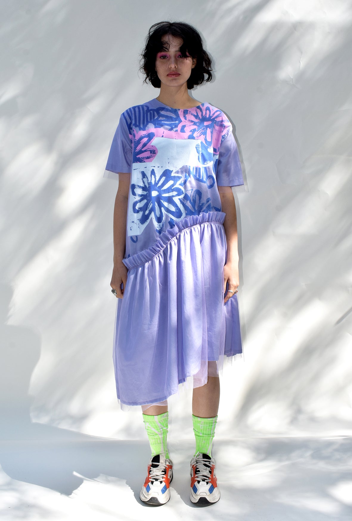 The juxtaposing floral screen print and asymmetric frill adorning this dress purple dress accentuate the label’s subversive, punk sensibility. It’s crafted from cotton satin and layered with tulle to an effortless, loose-fit silhouette.