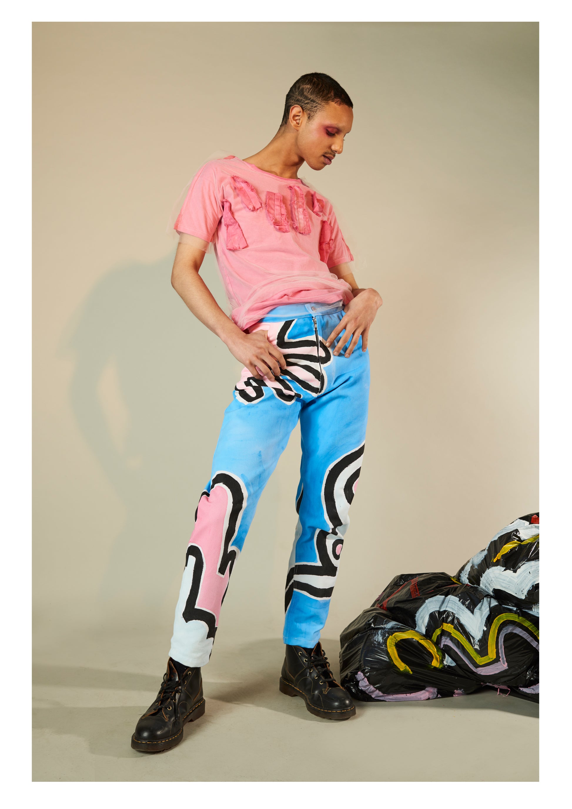 Layered T-shirt style top with sandwich-like construction of soft cotton jersey, translucent mesh and frayed cotton drill.