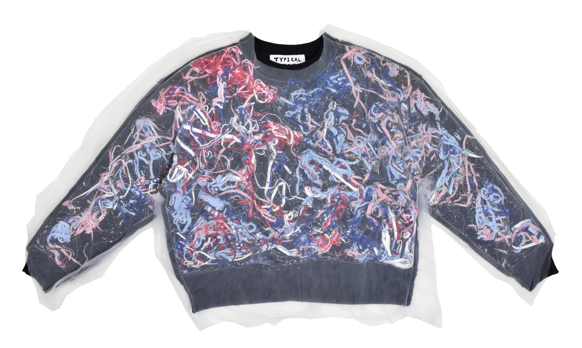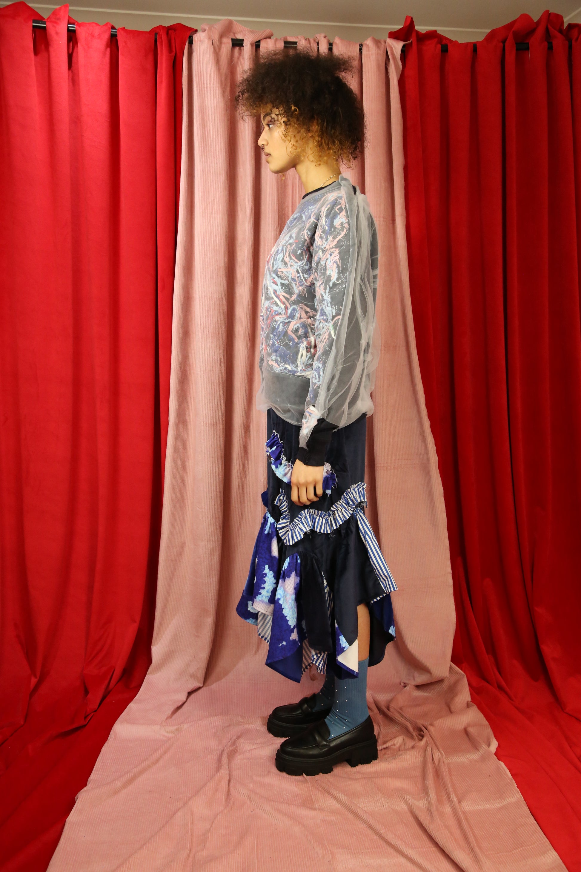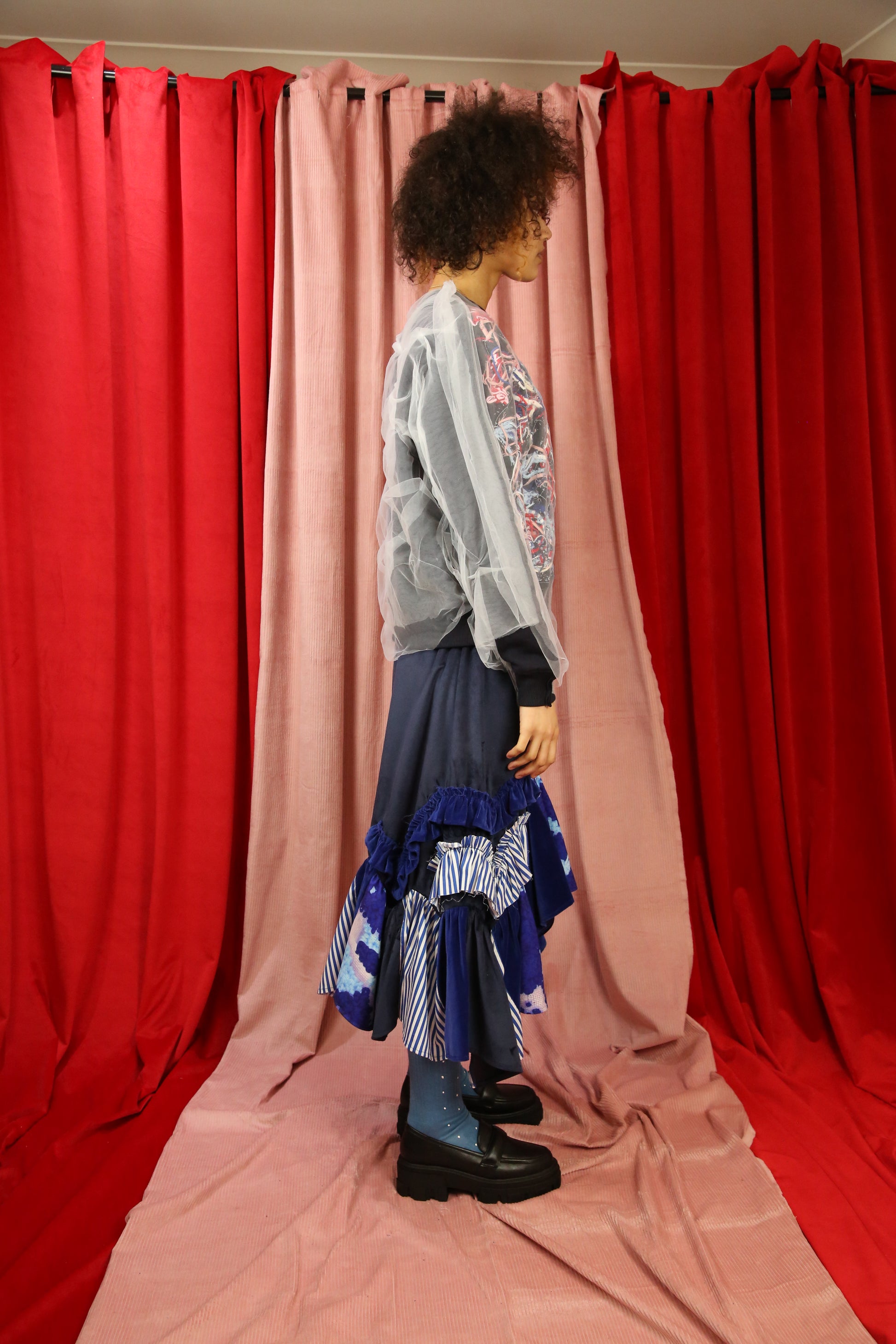 Slightly cropped fit, dark navy sweatshirt with applique of tulle and multi-coloured pieces of fabric.