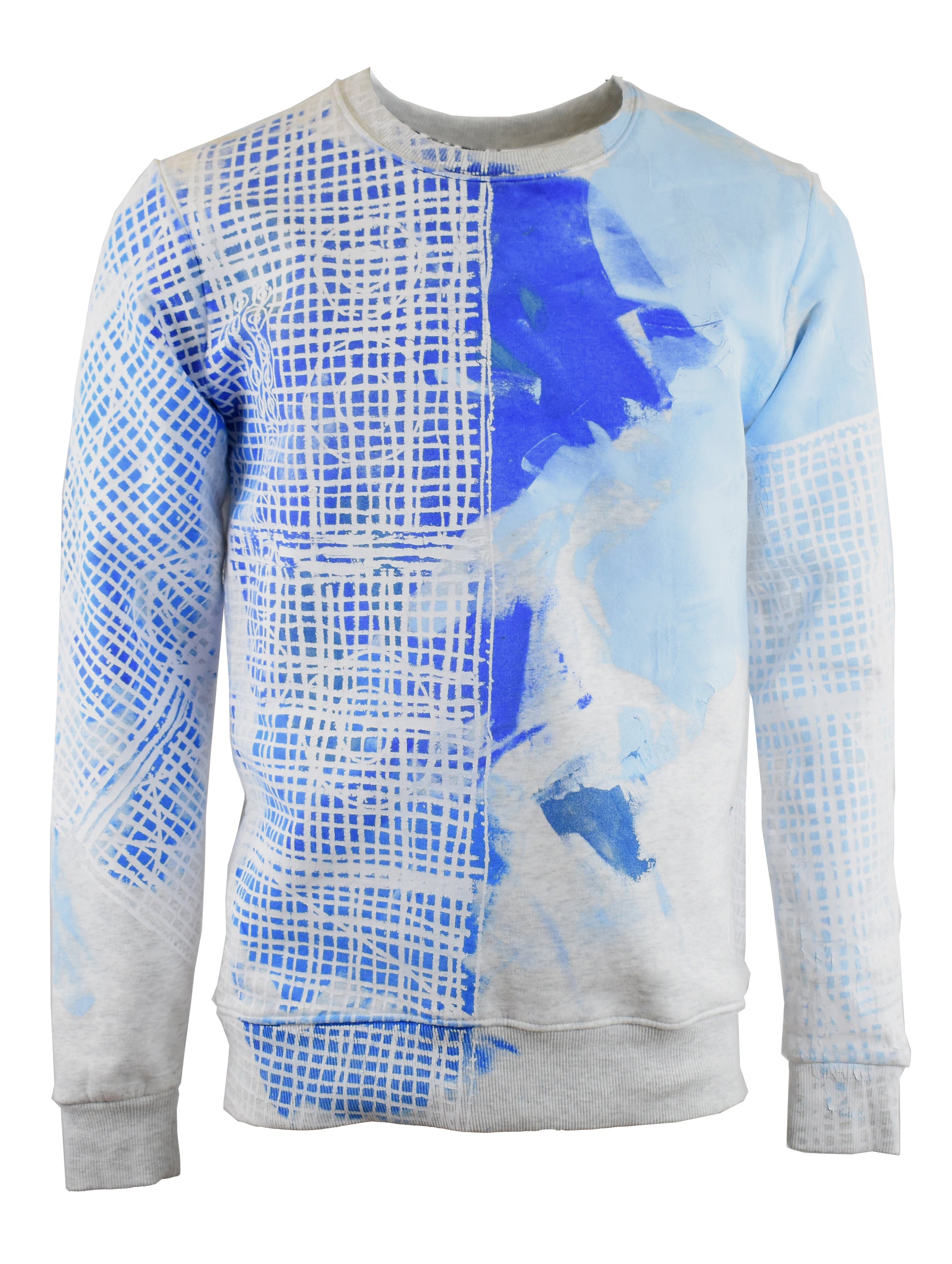 Screen printed panels sweatshirt with cutting mat motif and hand painted, textured and reflective elements.