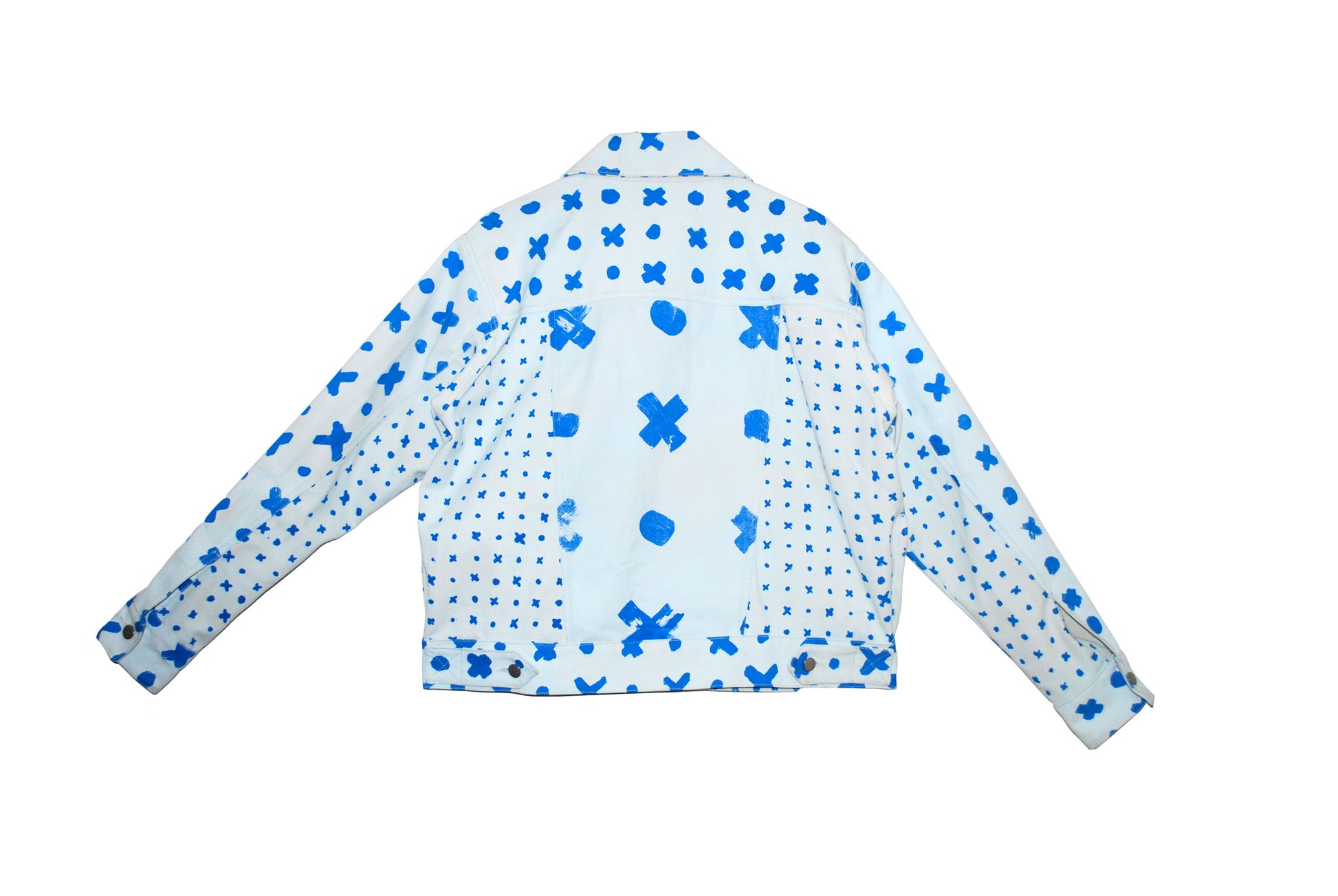 Inspired by pattern paper used in the construction of garments, this jacket has a hand painted background reminiscent of paper and printed blue spots and crosses.