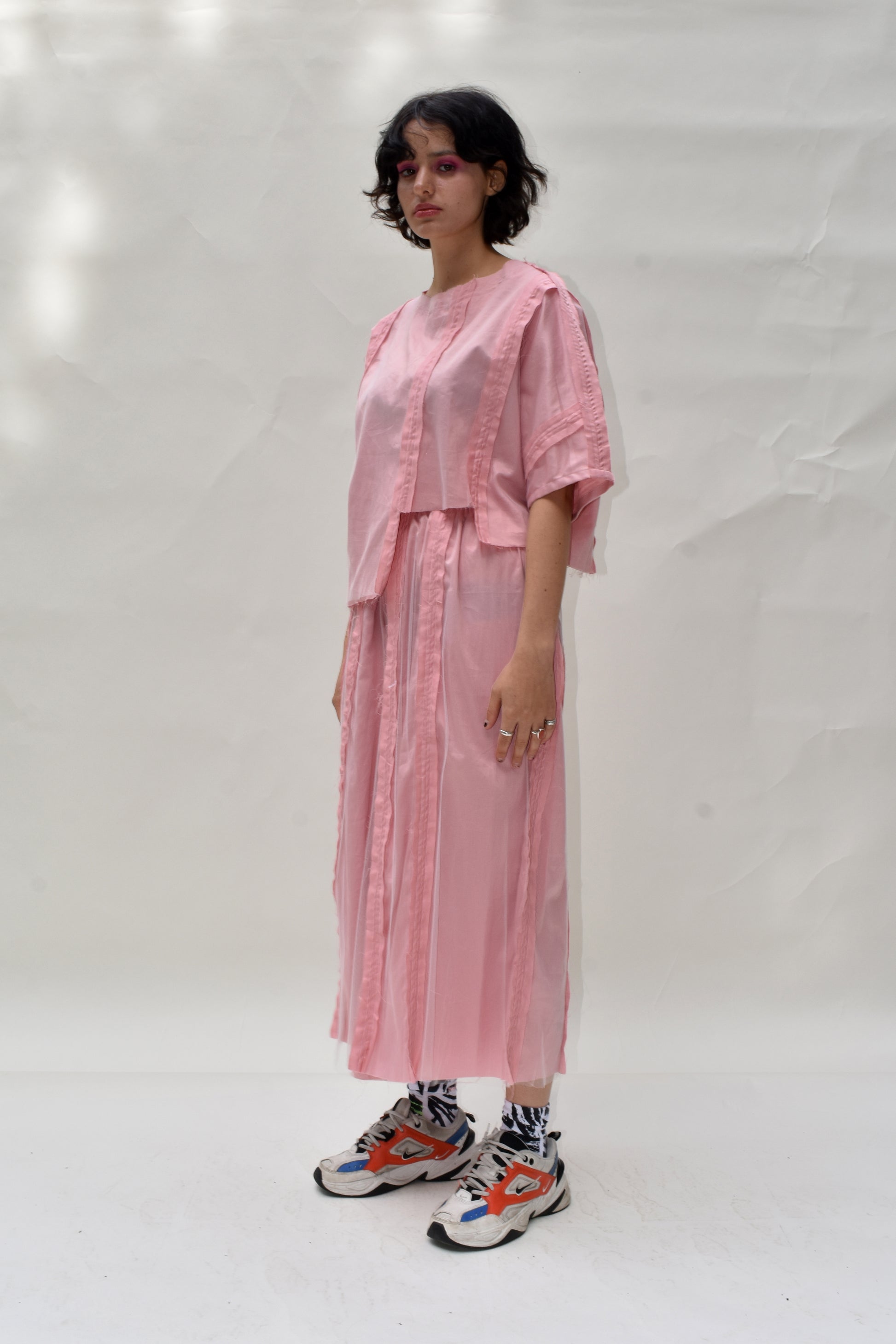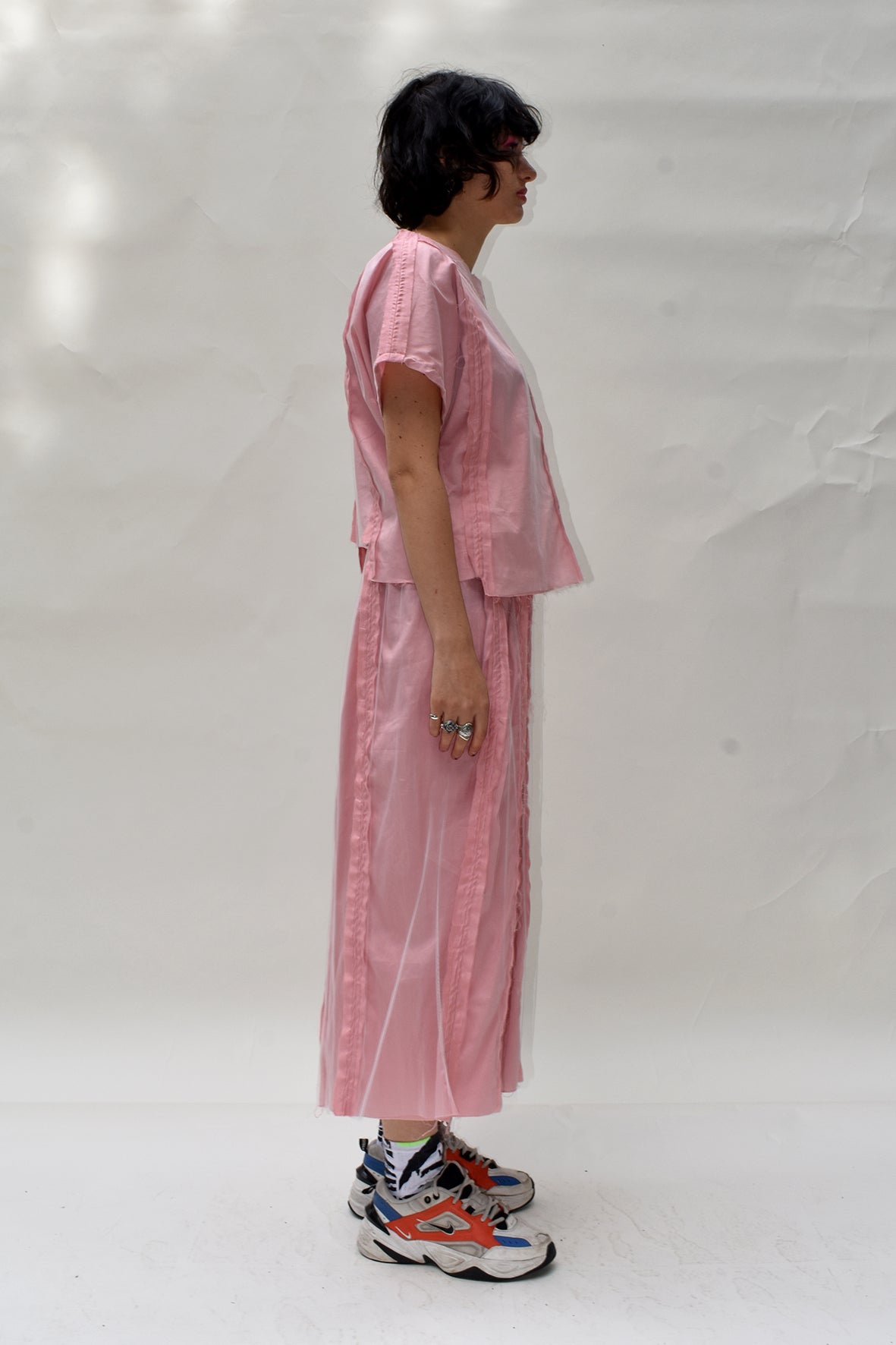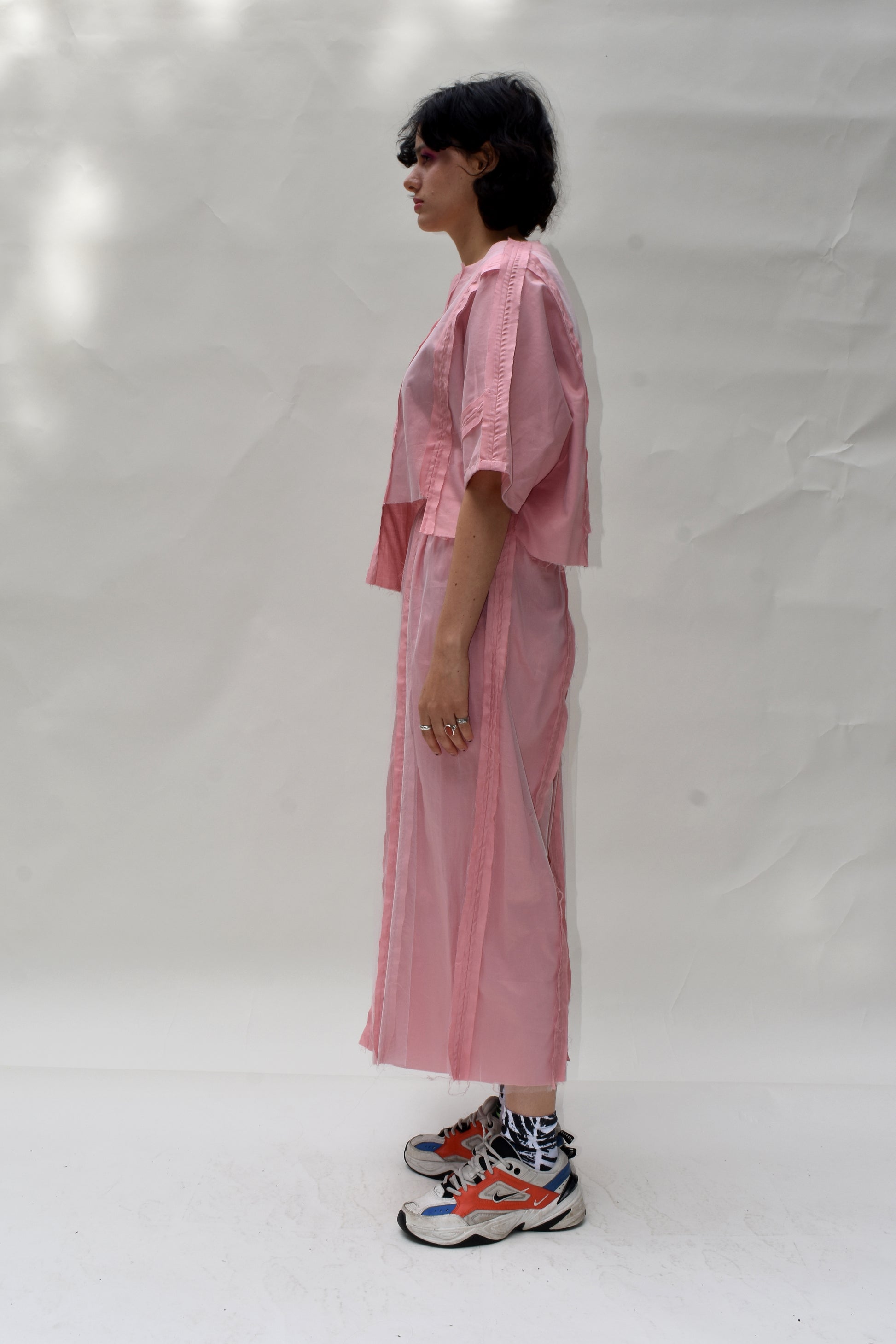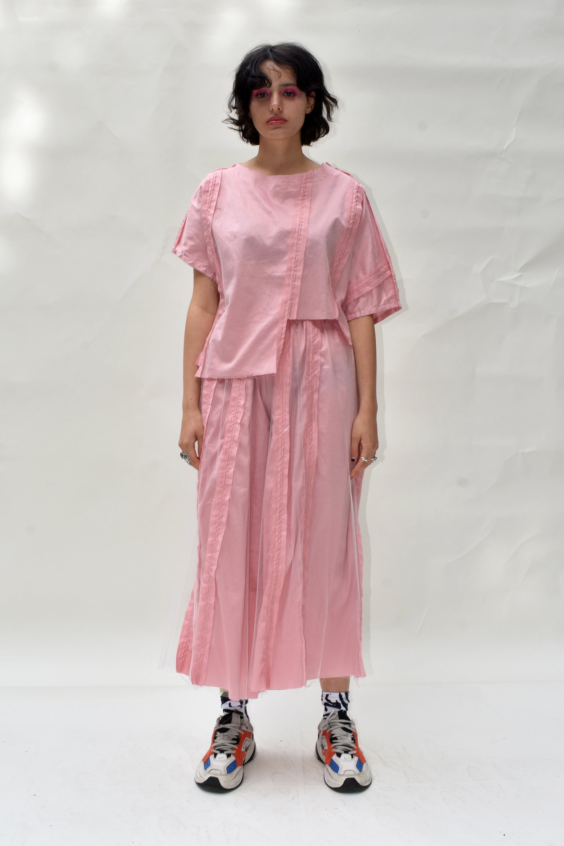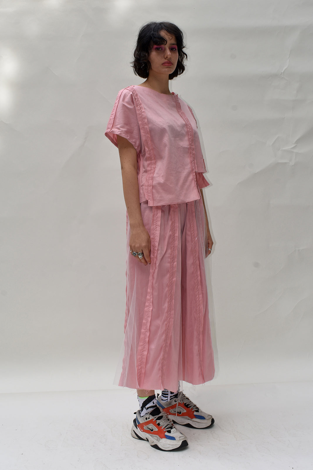 Satin cotton wide leg trousers with reverse punk seams and a soft tulle overlay.