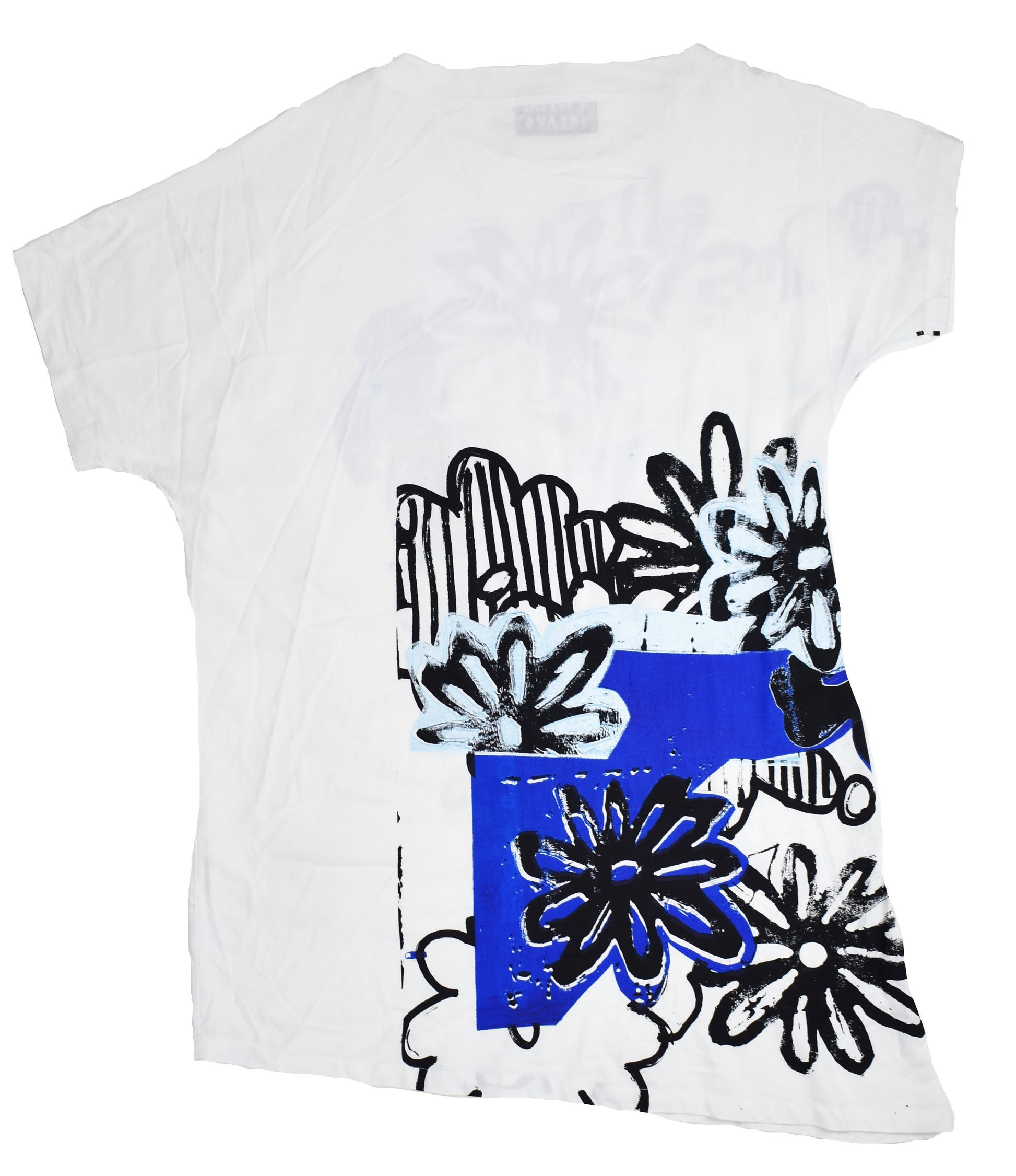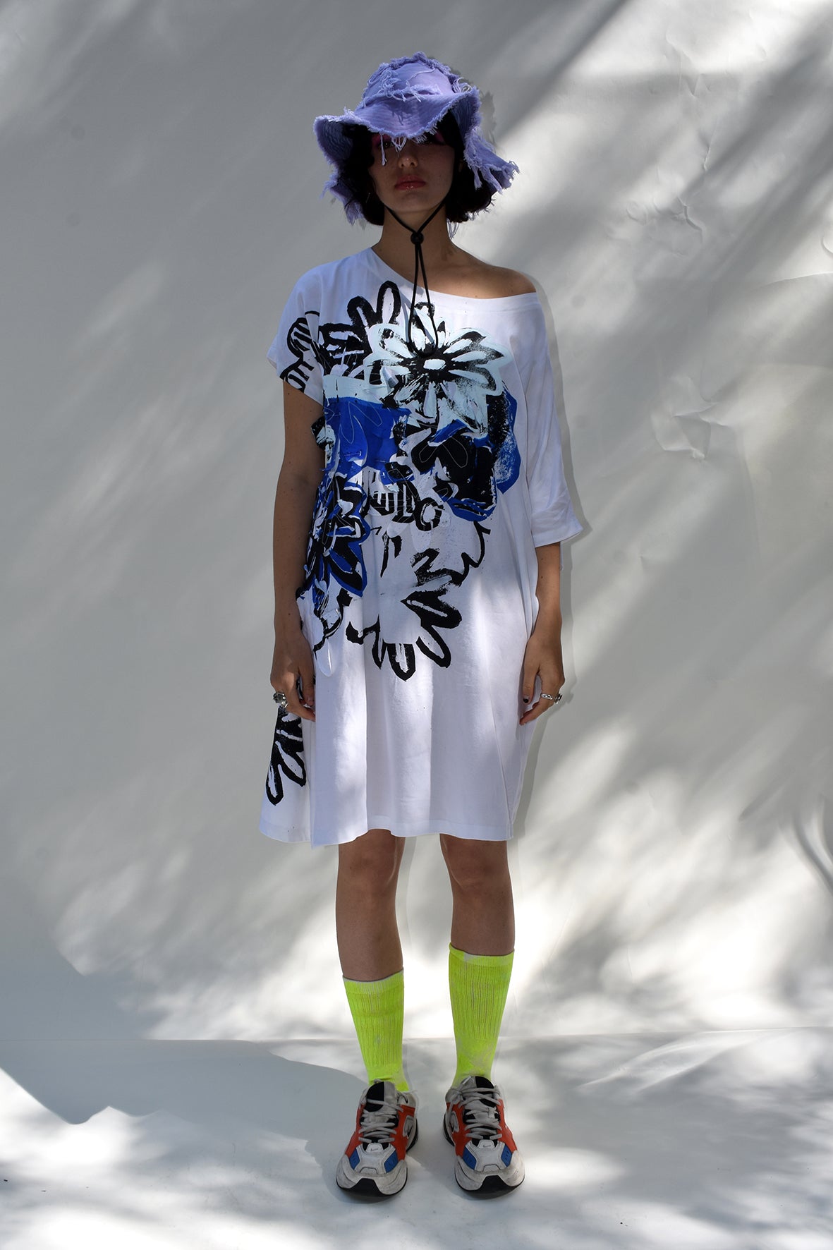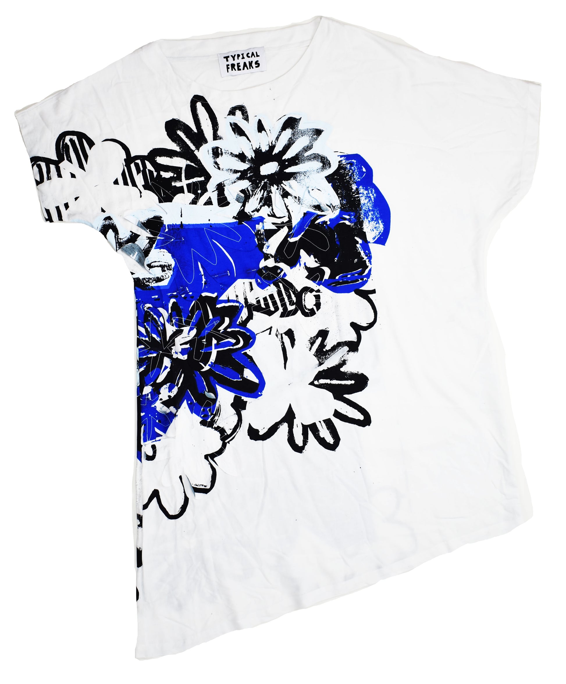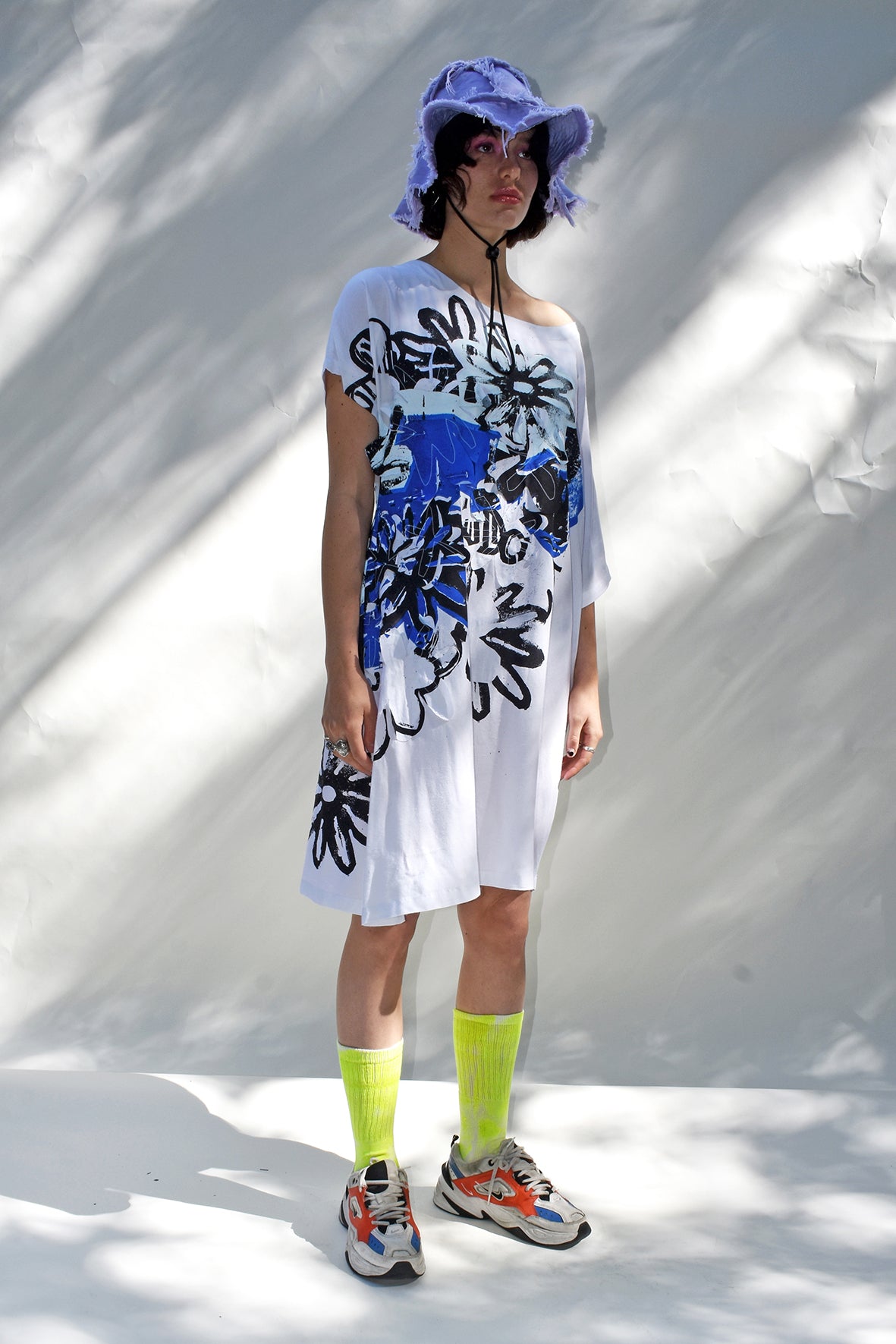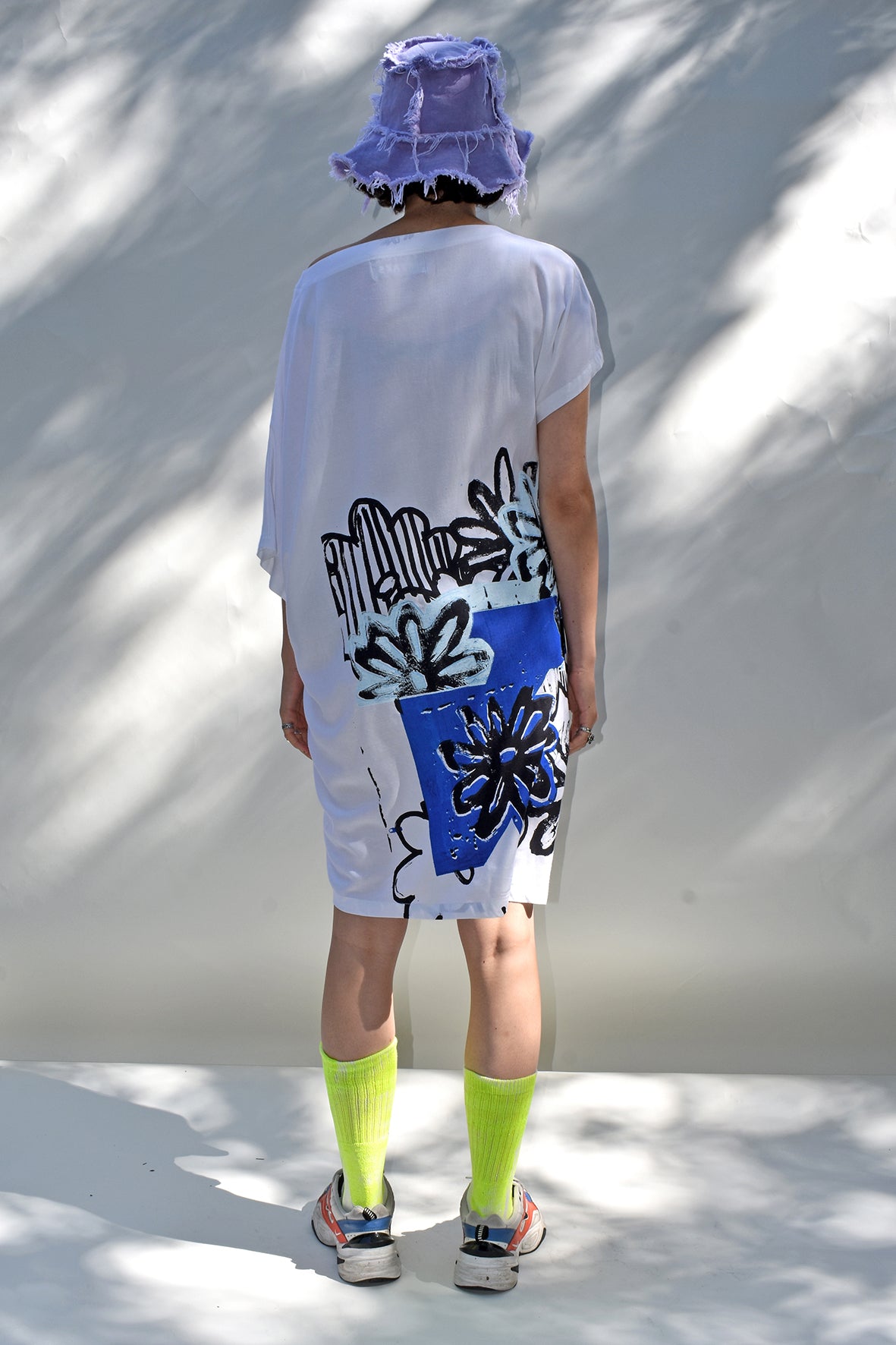 Asymmetric, airy midi dress cut from airy bamboo. It's designed in a loose silhouette with screen printed, appliqued flowers.