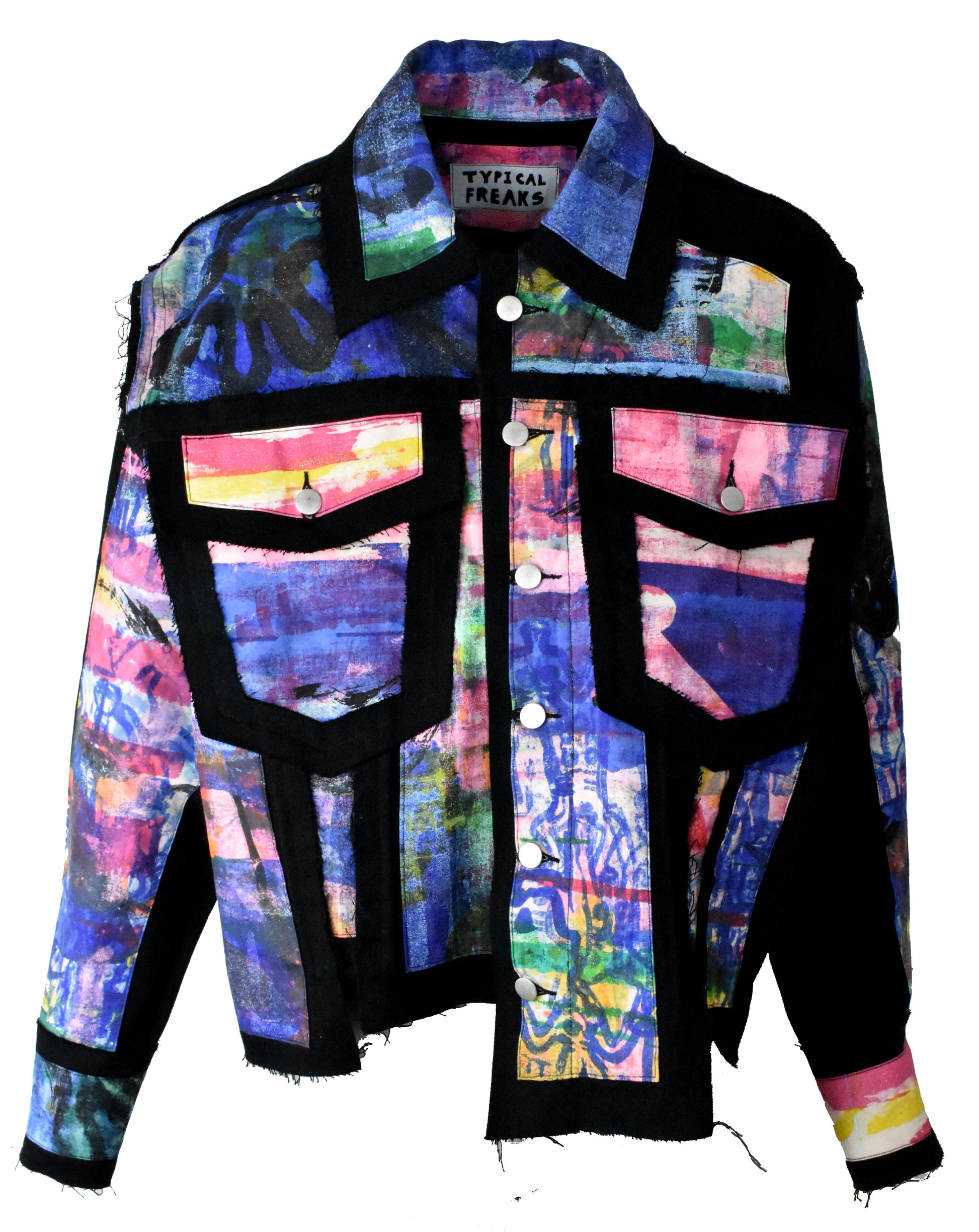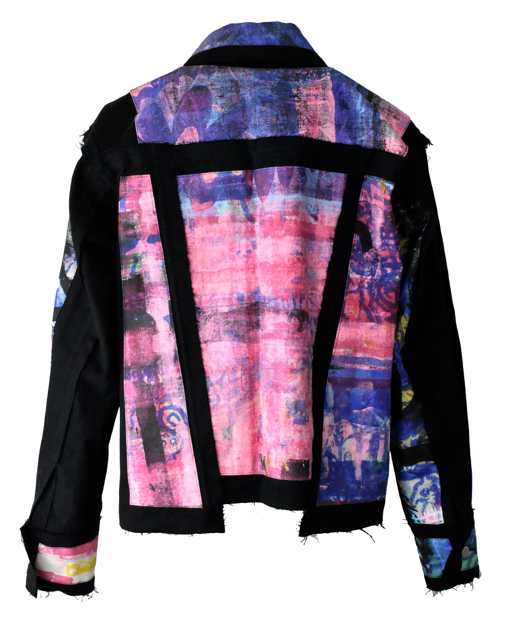 There is a sense of adventure when examining this denim jacket. Soft, black denim frames intricately printed backing cloth fabric. Each backing cloth fabric - which is used to protect a table during screen printing, can take up to a year to produce and features a visual diary of our prints and doodles from various seasons.
